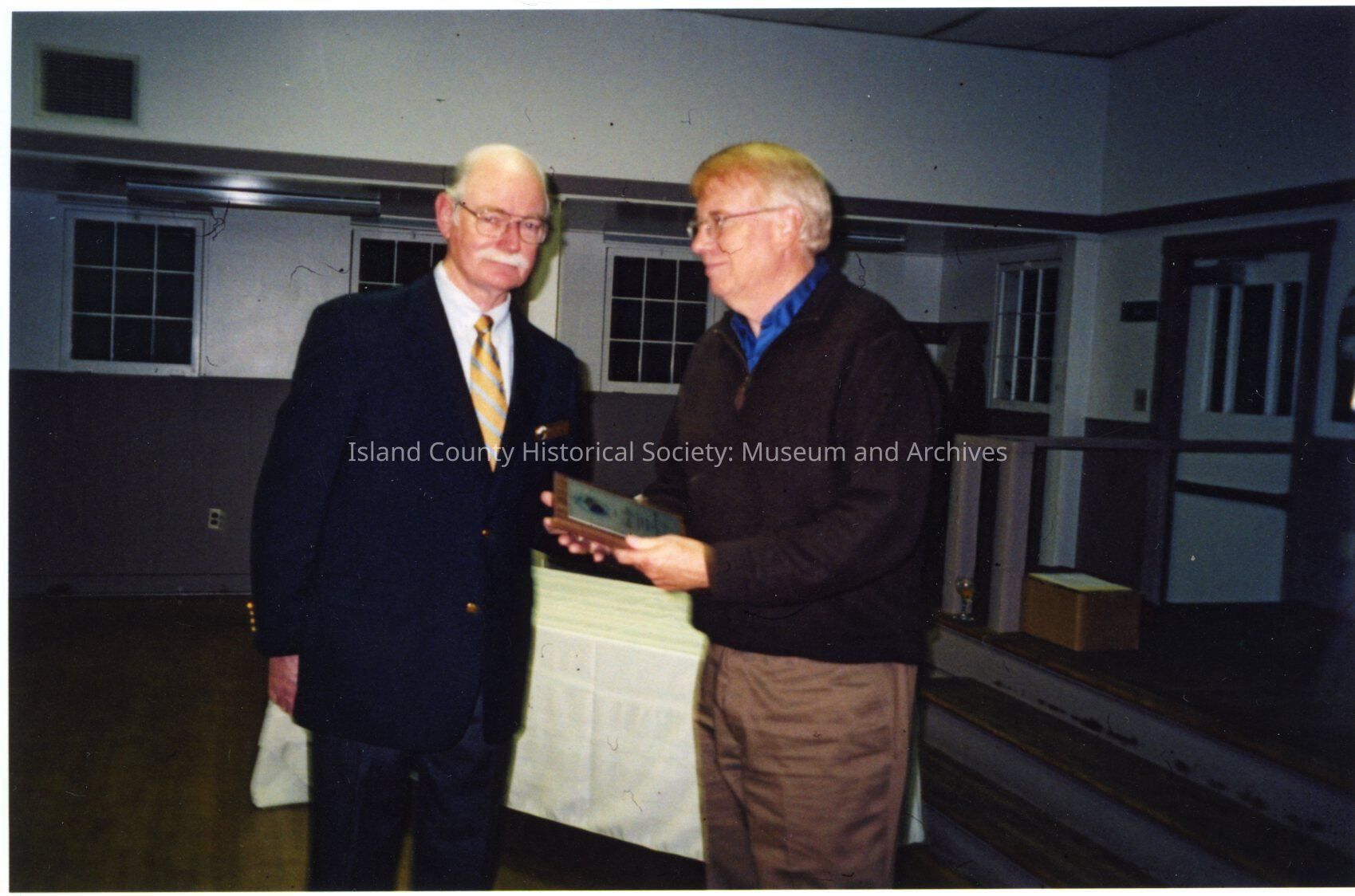 Photo of two men standing in a room of Rec. Hall. One handing a plaque to the other. Written on the back of the photo is "? Maue Gale."