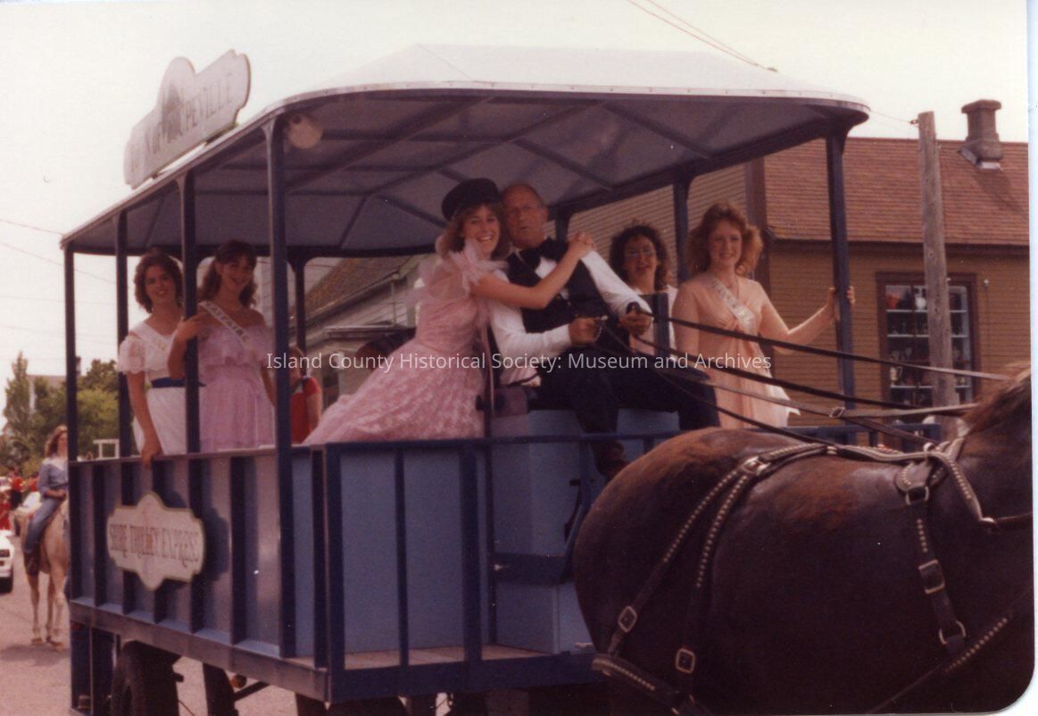 Photo of Coupeville festival. Wagon being pulled by a horse with people inside the wagon dressed in formal dress's and suit. On the back of the photo handwritten is "Lawrence Reubel".