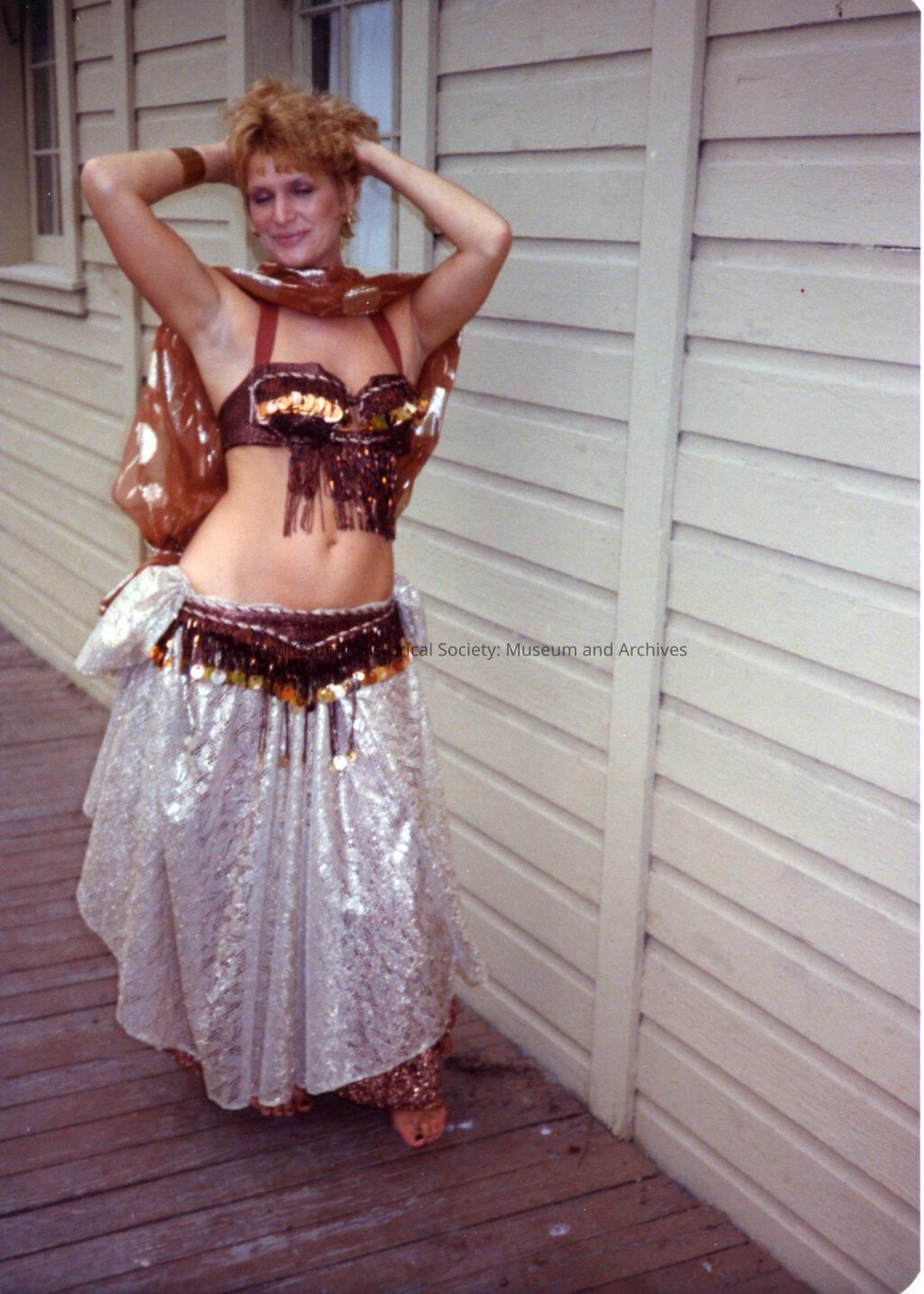 Photo of festival. On the back of the photo handwritten "Madame Shari Boyer". Dressed in costume standing outside a building posing for photo.