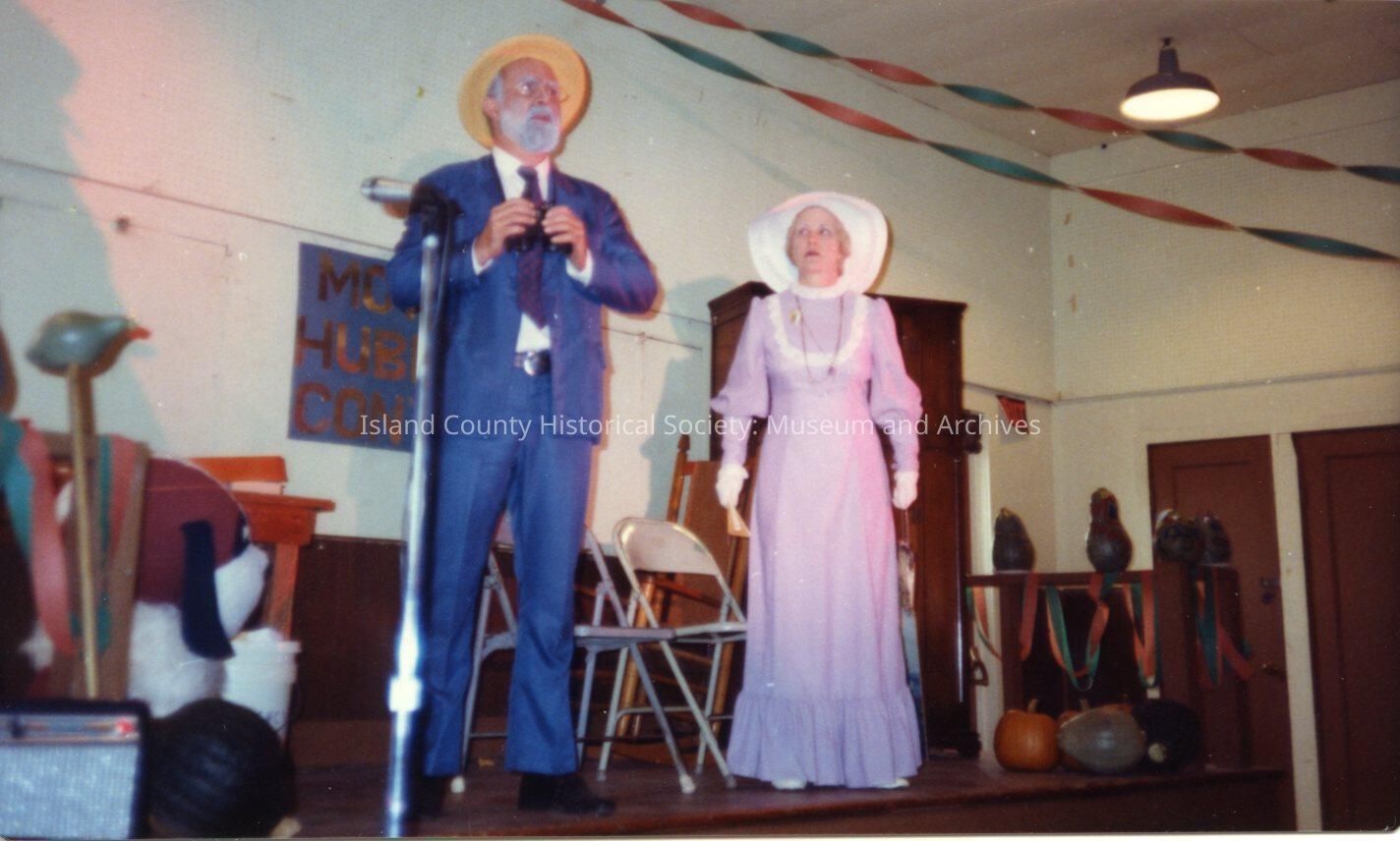 Photo of festival. Photo of a man and women on stage dressed in period clothing.