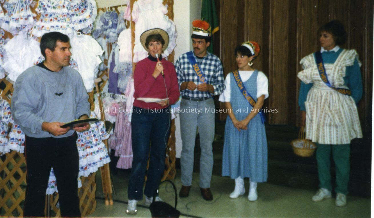 Photo of festival. Several individuals on stage, On the back of the photo it states: Queen and King Squash. Names listed are: MacWhyte, Judy, Don and Debbie Sherman, Ann Weaver (Mother Hubbard) with a date written for ll-88.Made/Created