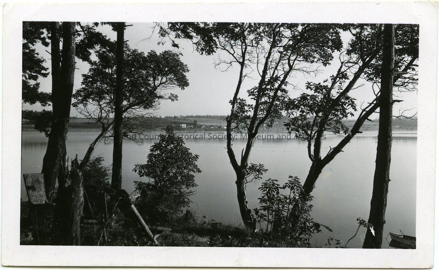 Photo of Penn Cove looking from Madronna Way north towards San de Fuca. The pier and buildings are across the cove. On the lower right a small boat is anchored. Trees. Written on the back: From end of Penn's Cove, From lawn of Capt Whidbey Inn.