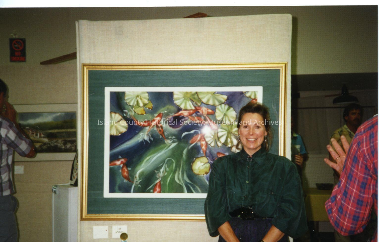 Woman standing by painting at the Coupeville Rec. Hall Arts and Crafts Festival. Handwritten on back Theresa Saia.