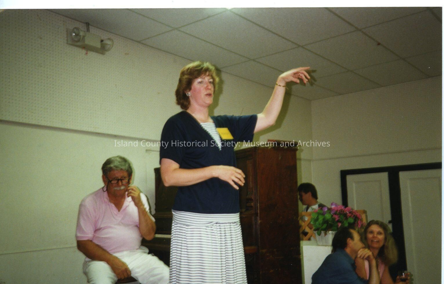 Woman standing by podium in building. Several other people nearby. Handwritten on back Sid Glover and Margaret Livermore.