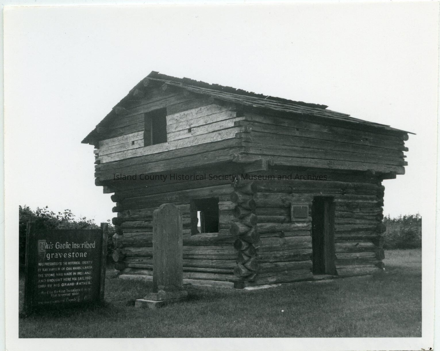 Front and side of Davis blockhouse. Door on the right with a small sign on the wall to the left. A tombstone is to the left next to a sign about the Gaelic inscription on the tombstone. On the back: James Davis blockhouse -1855- taken 1971