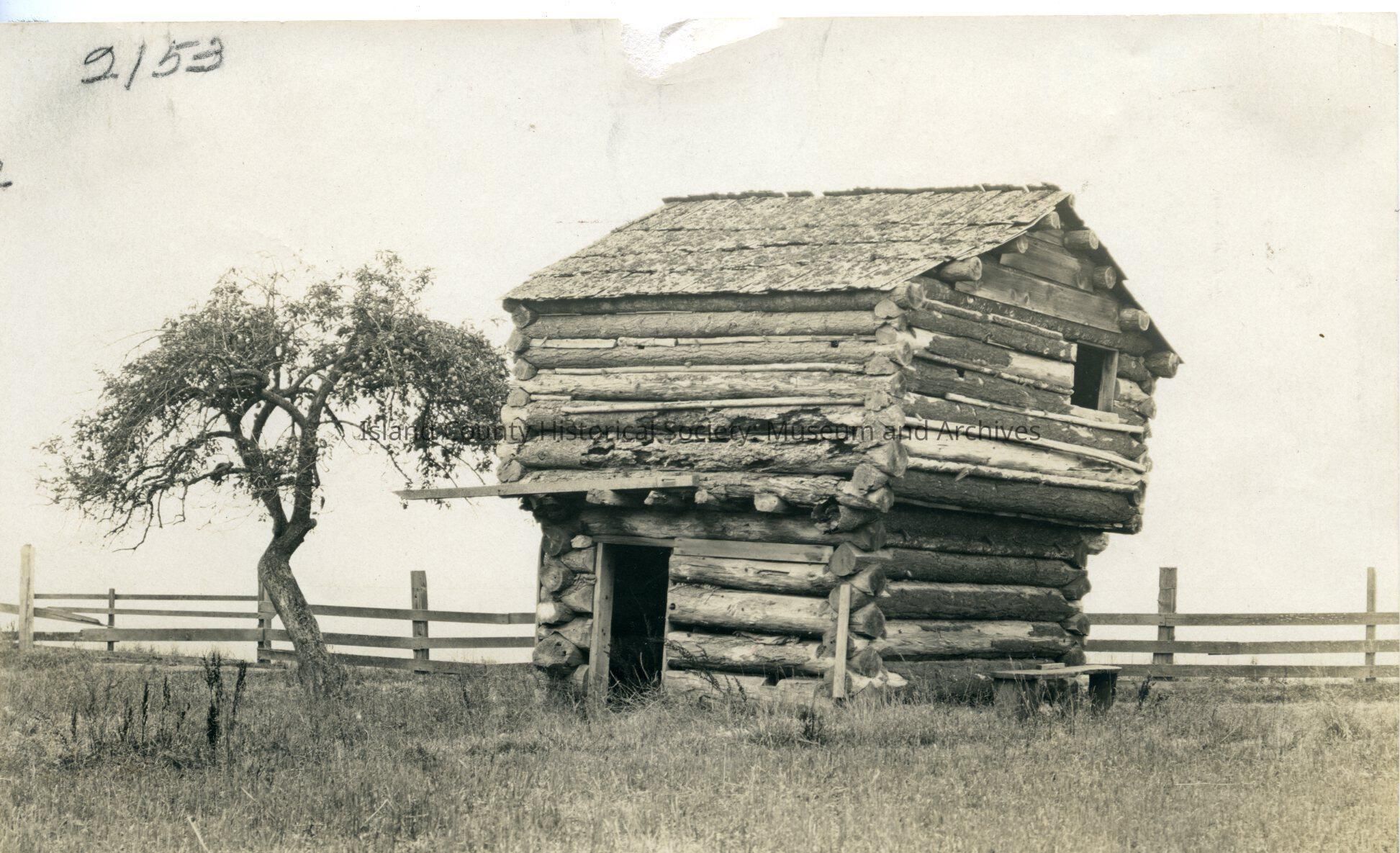 Front and side of Ebey blockhouse. Window on the is on the right. Door on the left side. A split rail fence beside the blockhouse. Tree to the left.The blockhouse is leaning to the right. Written on the top left: 2153