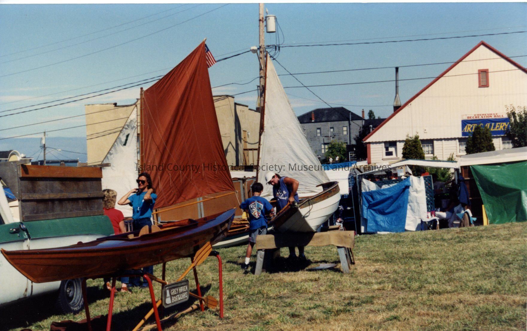 Might be part of Coupeville Arts and Crafts Festival. Shows two boats near booths in front of Art Gallery building, a few people and in the background is Penn Cove. On back is date of 1991.