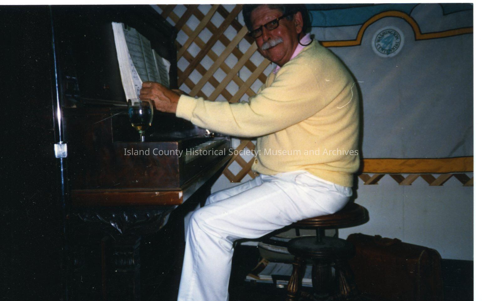 Man sitting at a piano wearing yellow sweater. On back says Sid Glover.