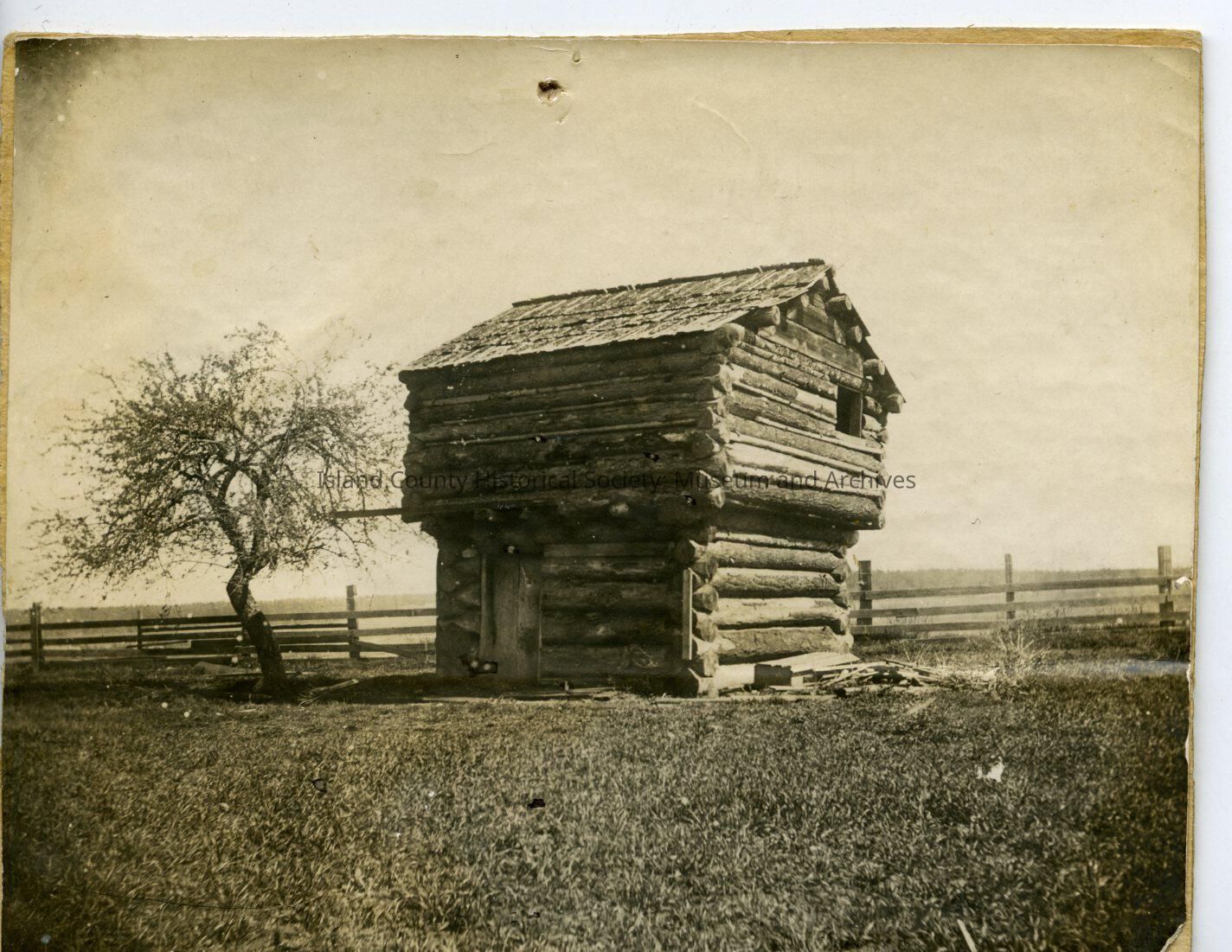 Front and side of Ebey blockhouse with the door to the left. There is a window on the top on the right side. There is a fence behind it. On the back: Ebey Blockhouse. Photo by W.H. Wilcox. 1909 The photo is attached to a piece of cardboard.