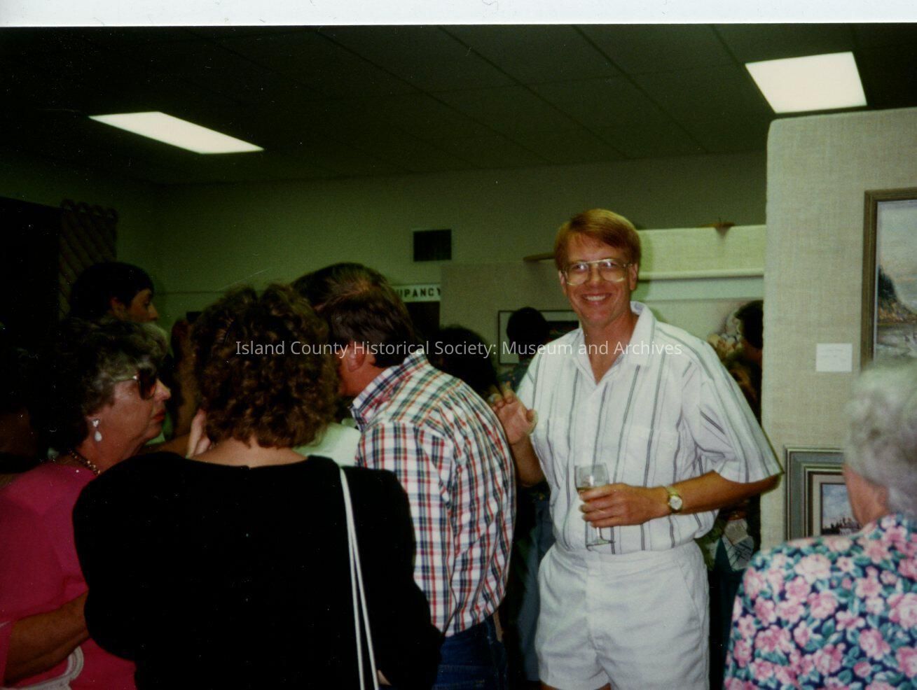 Several people with one man in white shorts holding wine glass, in probably the Rec Hall. Handwritten on back is Mark Gale.