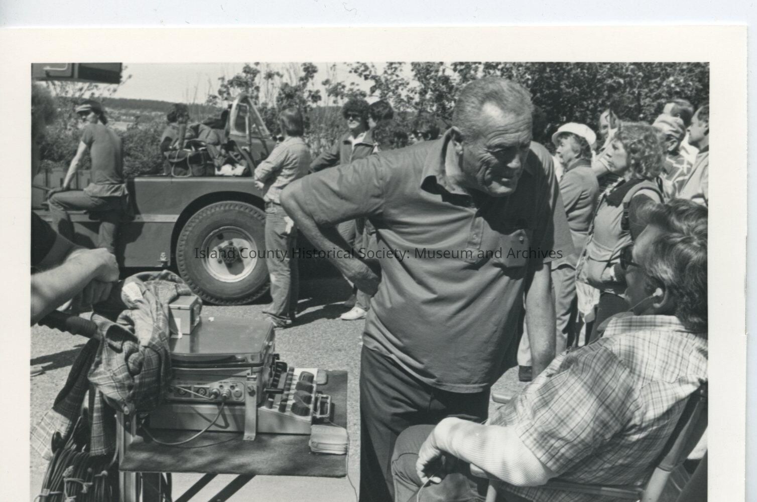 Black and white photograph people and equipment outdoors. Standing man leans over man seated in foreground near equipment. People in background are looking to left past vehicle. Filming of Cry for the Stranger in Coupeville, 1982. Note on back: Bart