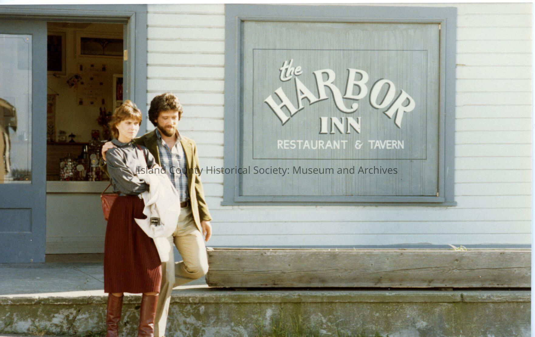 Color photograph of couple walking out of store on Front Street. Sign on building says "the Harbor Inn, Restaurant and Tavern." Man has arm around woman's shoulder. Filming of Cry for the Stranger in Coupeville, 1982. Note on back of picture: Cindy Pickett, Patrick Duffy.Made/Created
