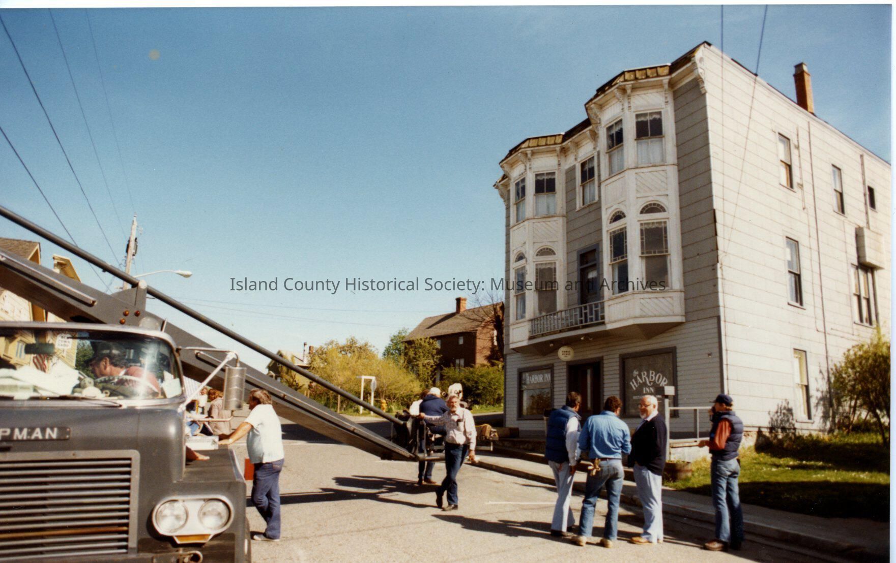 Color photograph people and film equipment on Front Street in front of Glenwood Hotel building.. Sign on building says "the Harbor Inn, Restaurant and Tavern." Filming of Cry for the Stranger in Coupeville, 1982.