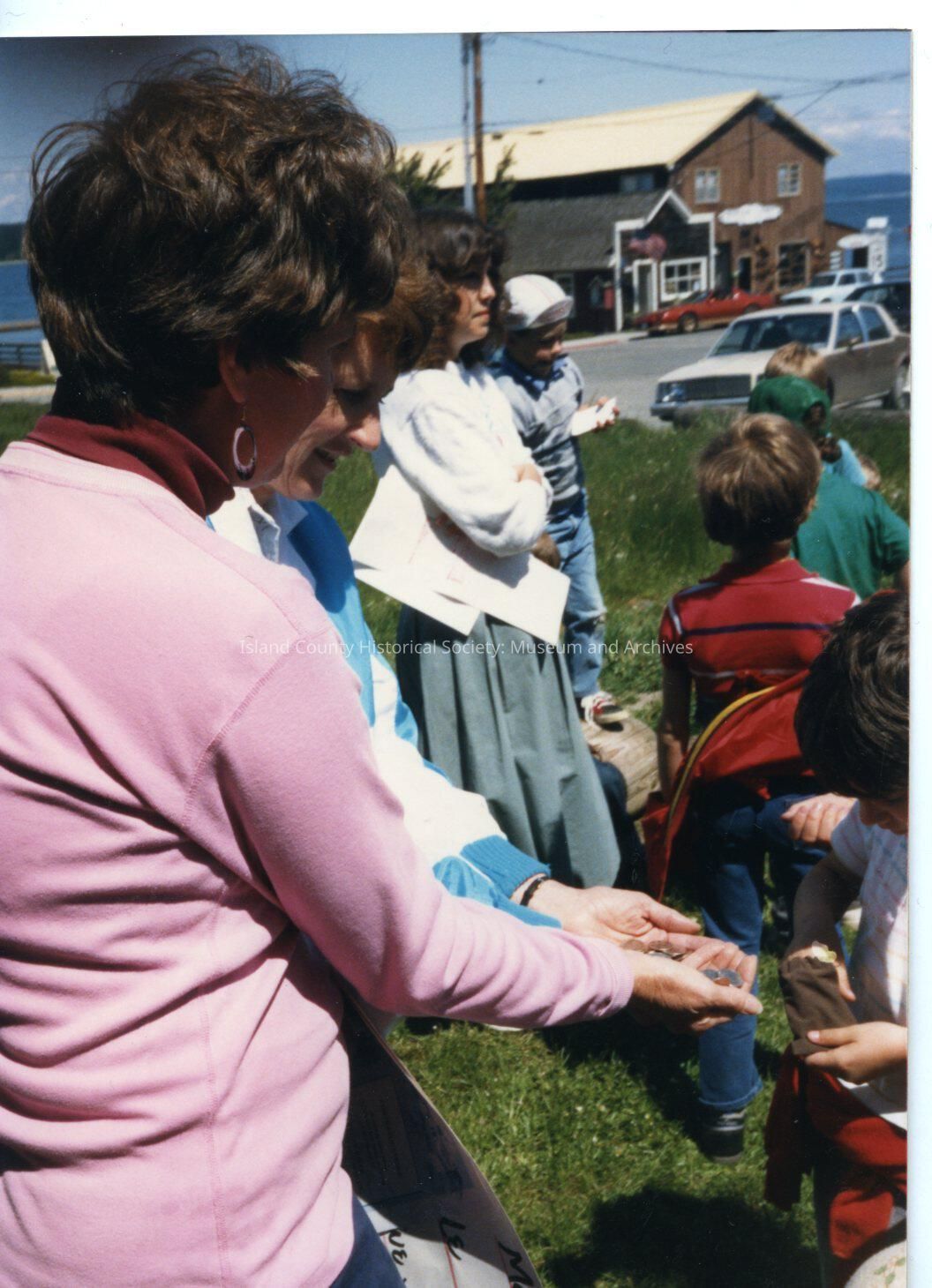 Color photograph of women and children at Alexander and Front Street in Coupeville. Two women hold coins in their hands and a child pulls coins from a cloth bag. Note on back: Quarters for Coupeville grade school tile 5-89.