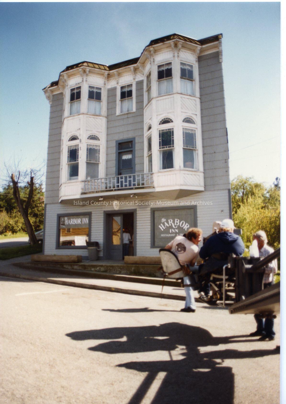 Color photograph of film equipment and crew on Front Street in front of Glenwood Hotel building. Sign reads "the Harbor Inn." Men sit on boom with camera. Filming of Cry for the Stranger in Coupeville, 1982.