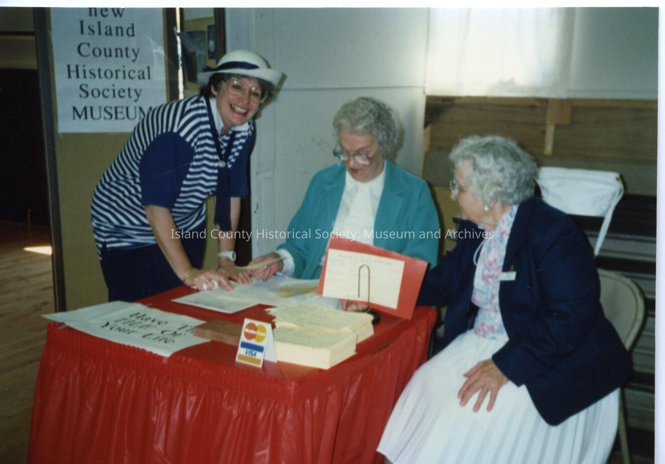 Three people inside Museum at red table. On back it says Emily W/Volunteers. 7/88.