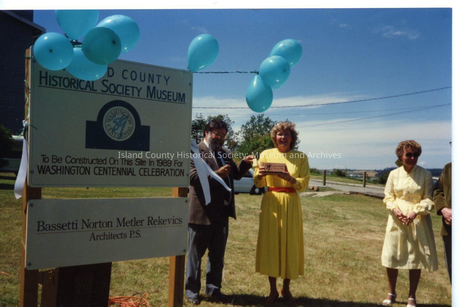 People standing by outside sign with blue balloons. Handwritten on back says "Del Bennett presenting Jean Gardner with tle. 7/88.