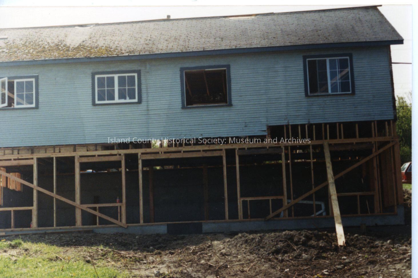 The building is the same structure shown in 2018.052.457, which shows the date 1/28/89. A comparison of both photos show that the building in the earlier photo has a shingled exterior and there is a chimney and a vent at the apex of the roof. The building's exterior was removed, as well as the chimney and the building was moved to Coveland Ave, next to the Oyster Catcher Restaurant, elevated and a new ground floor added. (see 2018.052.458Made/Created