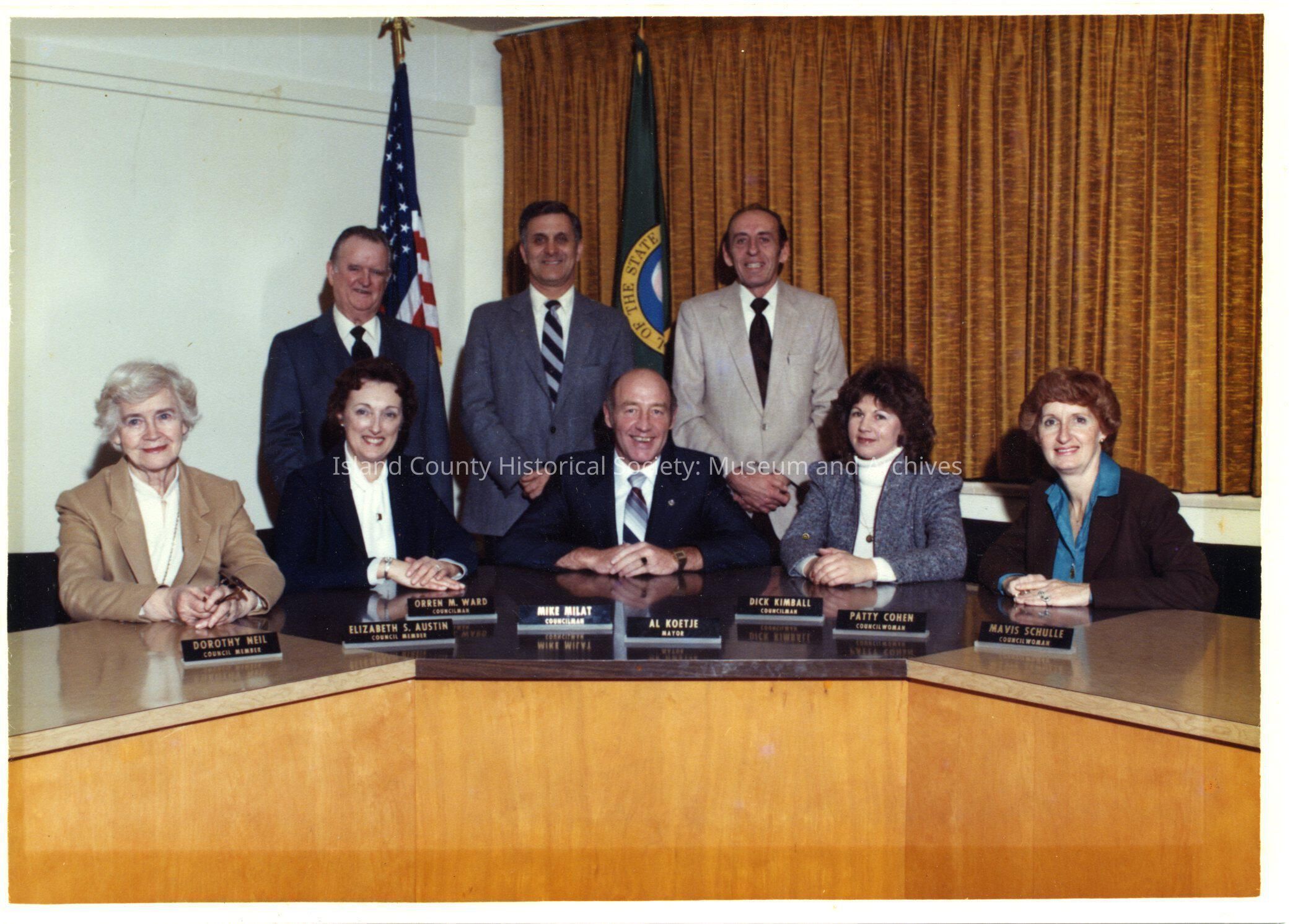 Color photo of an Oak Harbor City Council, February 1982. Made up of four men and four women, five are seated, three standing behind them. Left to right in front: Dorothy Neil, Elizabeth S. Austin, Al Koetje (Mayor), Patty Cahon, and Mavis Schulle. In back left to right: Orren M. Ward, Mike Milat and Dick Kimball.Made/Created