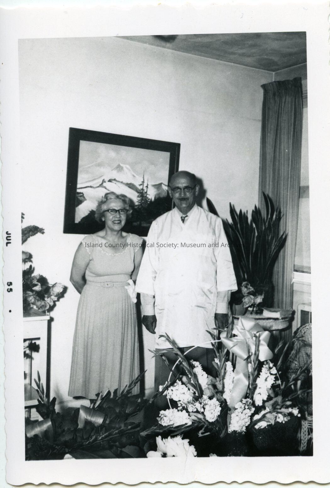 Black and white photo of Dr. Carskadden standing beside a woman in dressy almost sleeve-less dress in front of a picture of mountains and near a window with blinds pulled. He wears glasses and has a mustache. Flowers are in baskets, including a large arrangement with a bow in front of them. Photo is dated on the front: Jul 55
