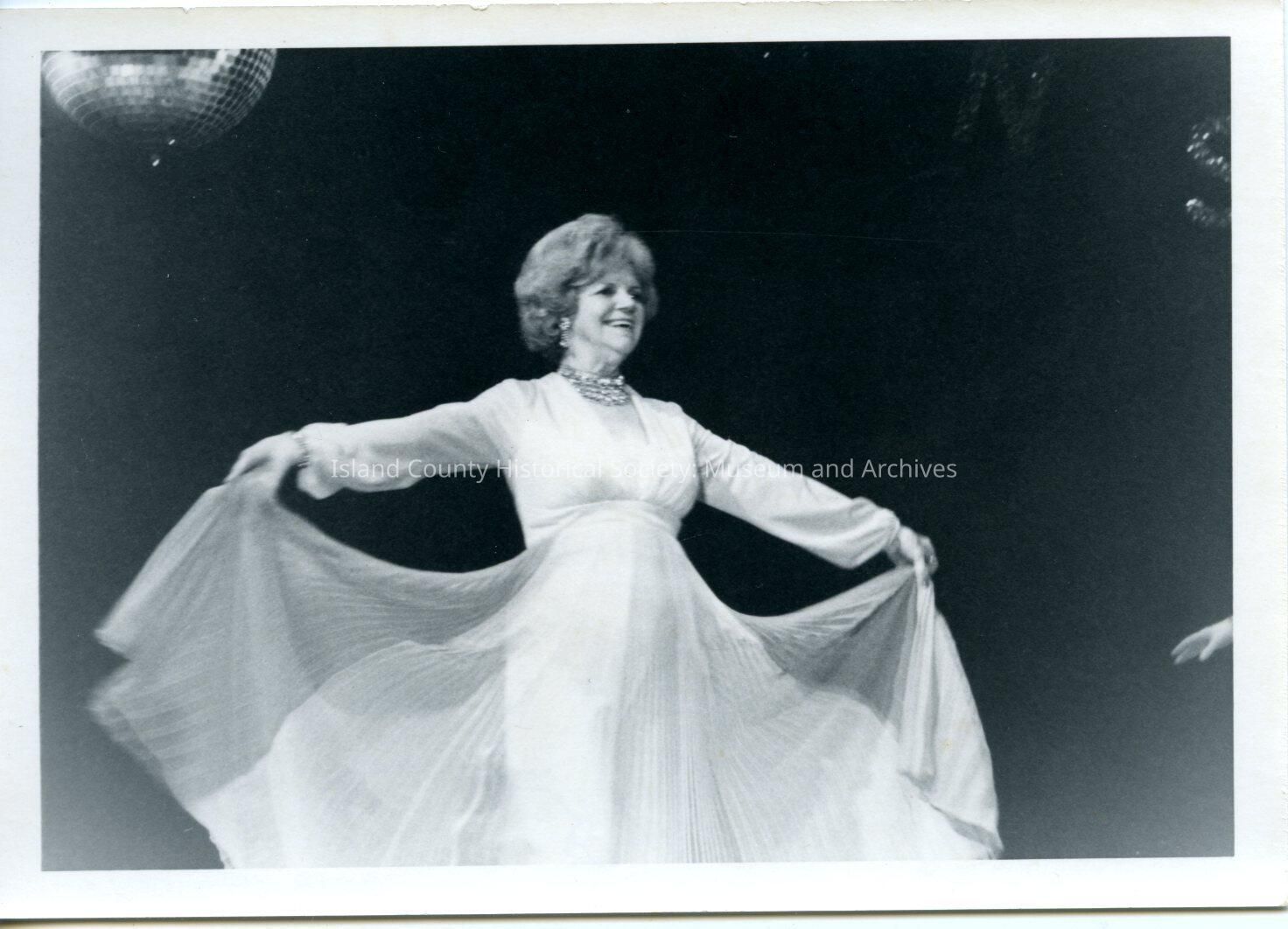 Black and white photo of Katheryn Johnson wearing a flowing white dress, with her arms spread to each side holding part of the overdress up like wings, probably on stage under a "disco" ball. Written on the back is her name and the year 1975 and photo by: Helen Chatfield.