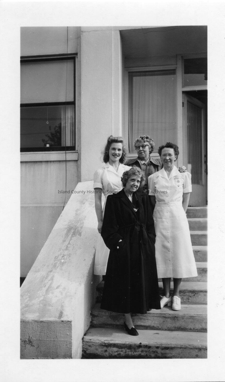 Black and white photo of 4 women, at least one is a nurse, on the steps of a building. Two women are wearing coats, at least one is wearing a nurse's uniform. The steps are concrete and wide and narrow, wide concrete wall beside the steps. Stamp on back: Jacobson's, Bellingham, WA Jun 14, 1950Made/Created
