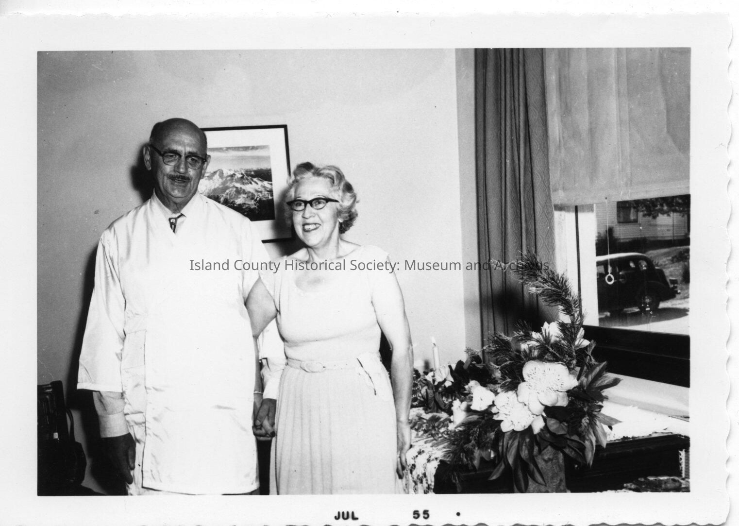 Black and white photo of Dr. Carskadden standing beside a woman in dressy almost sleeve-less dress in front of a picture of mountains and near a window with blinds pulled. He wears glasses and has a mustache. Flowers are in baskets, including a large arrangement with a bow in front of them. Photo is dated on the front: Jul 55,