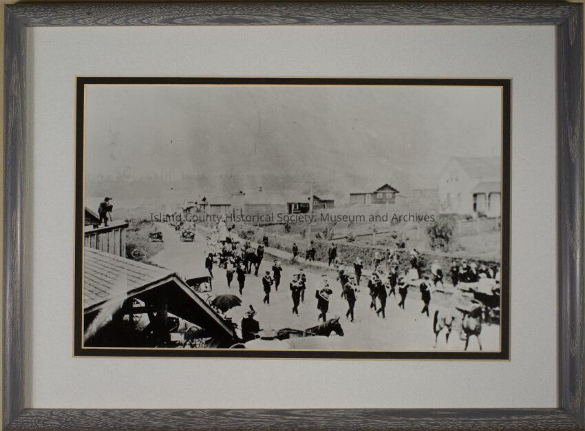 Black and white photo in gray frame of the Oak Harbor Band marching down what is now Pioneer Way. There are only a few structures. A few cars and some horse/buggies. A man on top of a building looks like he is taking movie picture of the event.