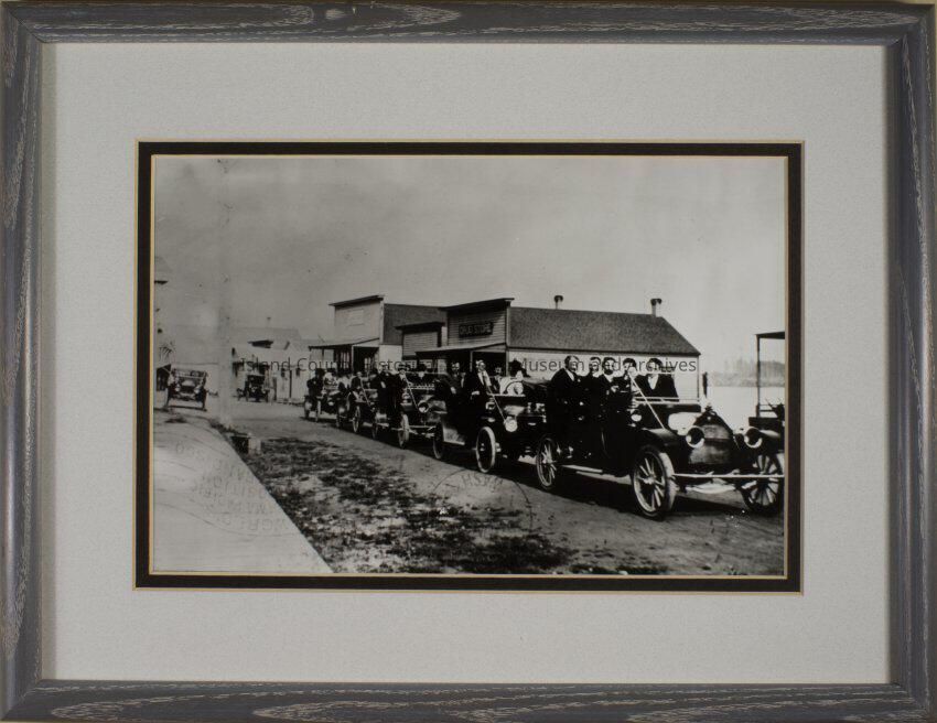 Black and white photo in gray frame of row of automobiles on Pioneer Street in Oak Harbor, WA. Drug store and other buildings. Photo was a postcard - the date stamp and cancellation are visible in the lower left corner and lower center part of the photo.