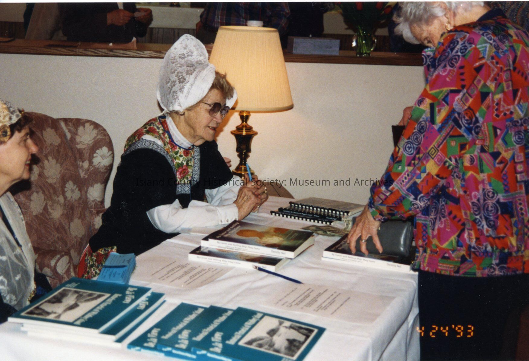 Color photo of two women seated at a table, in tall wingback chairs, white tablecloth, "De Ja Views" books in front of them. A woman in bright colored top is in front of the table. THe woman at the left has a dark dress and lace shawl and cap. The woman in the center has a dark top, flowered shawl, lace hat, white shirt. On the back: Jan Ellis, Marian Merrill. Dorothy Neil signing her latest book. Dated: Apr 23, 1993Made/Created