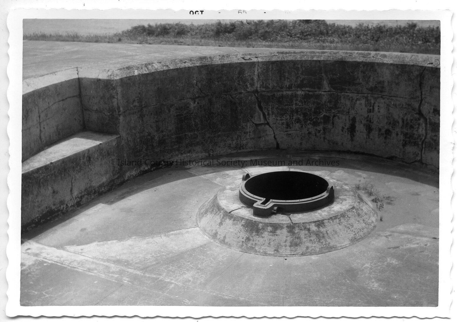 Kodak black and white photograph of Fort Casey gun casing taken in October of 1965.