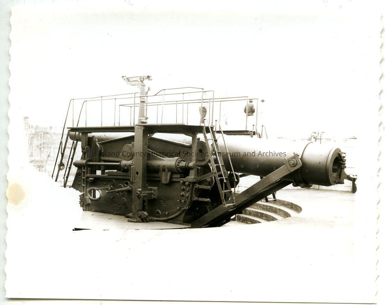 Black and white Polaroid photograph of one of Fort Casey's dissapearing guns.