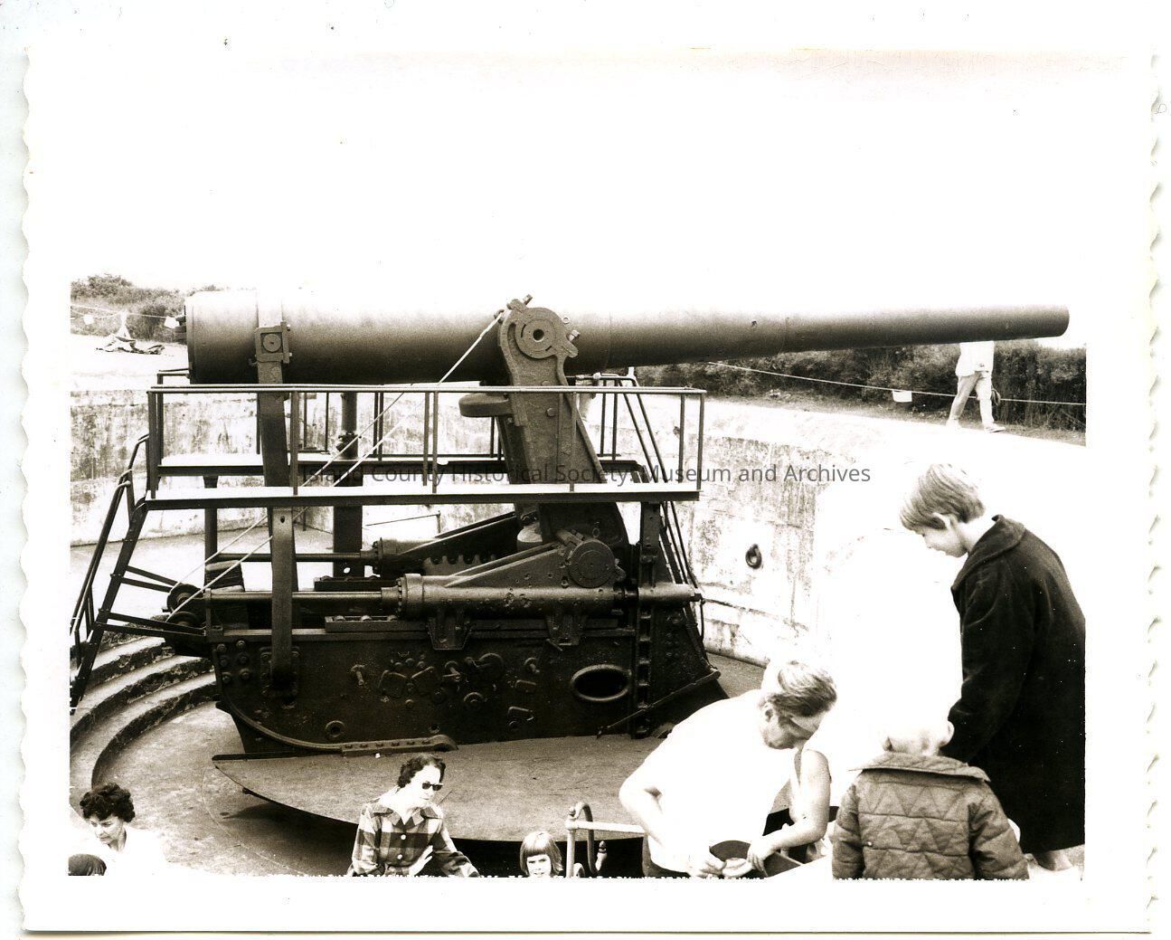 Black and white Polaroid photograph of one of Fort Casey's dissapearing guns and a group of people inspecting it.