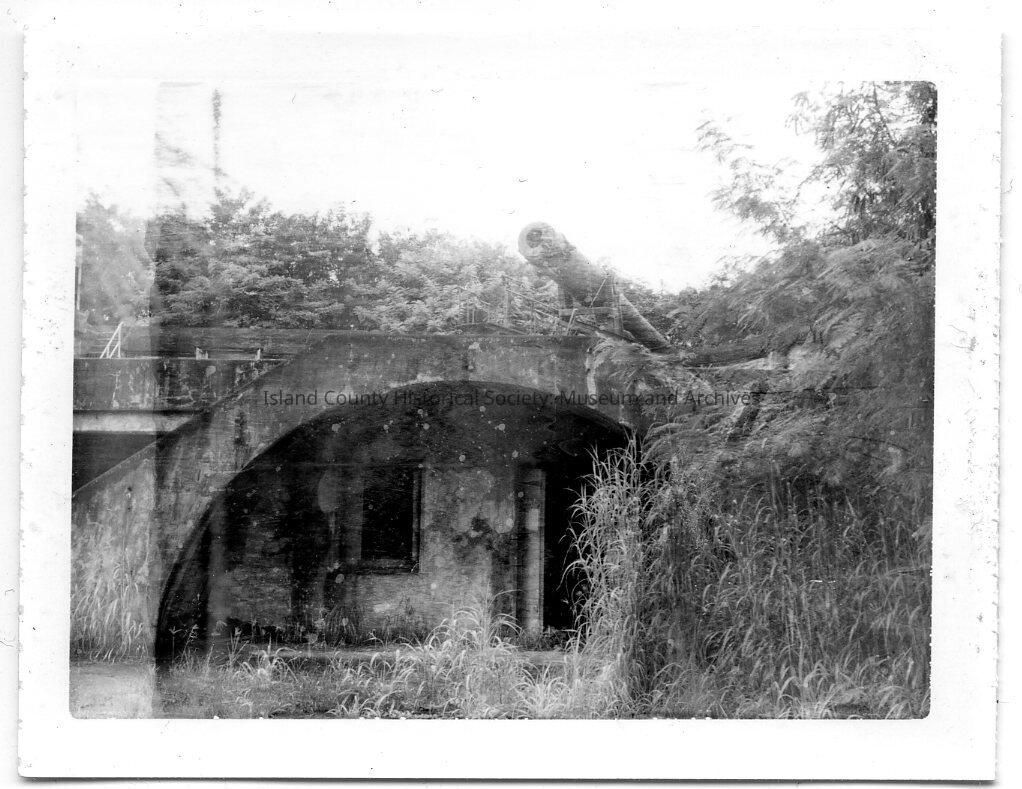Black and white Polaroid photograph of a bunker, gun, and trees. Written on the back: Main battery FORT Windt Grande Island, Luzon Phillipine Islands Large 10" mortar VISIBLE in top right corner 3 oct. 1961