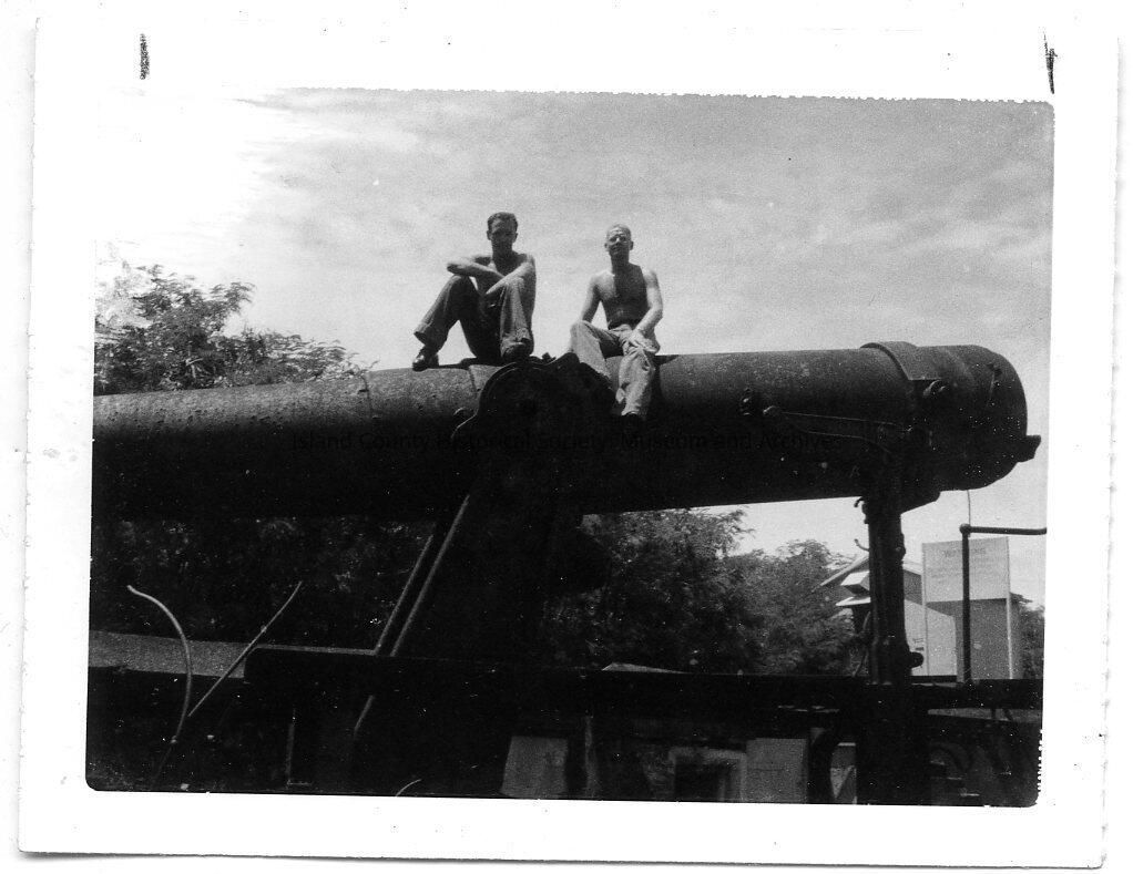 Polaroid black and white photograph of Fort Casey gun and two men. Written on back: "James Sutherland Left. Ron Van Dyk Right sit atop one of 2 mortars at Grande Island P.I. 3 oct, 1961 2.2 3+4"