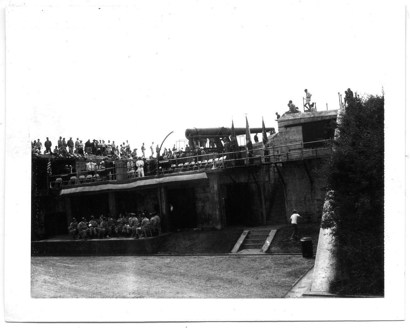 Black and white photograph of Fort Casey gun and crowd at a side angle.