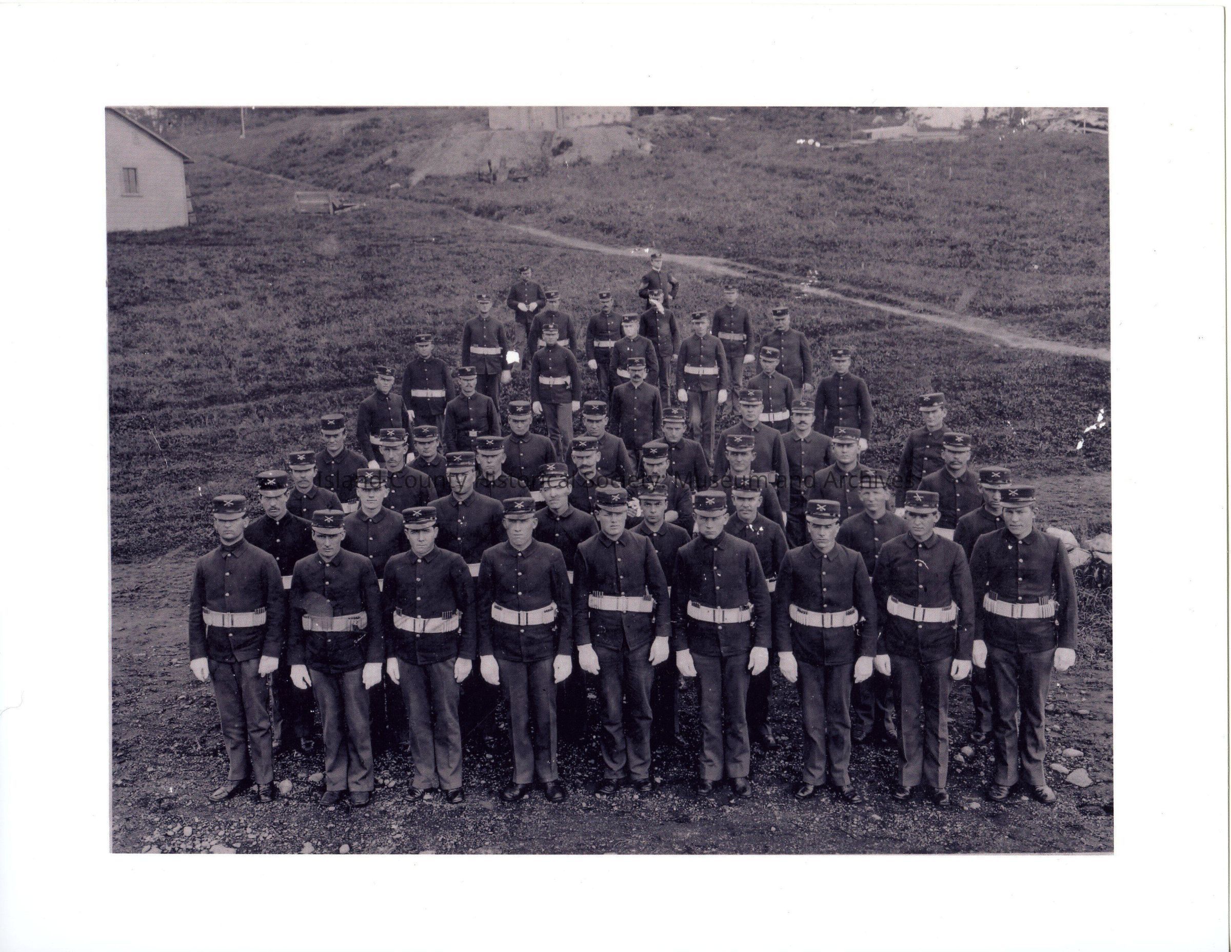 Black and white photograph of a group of soldiers standing in formation. On the back: "71st Company 1901 Earliest Company Photo Available"