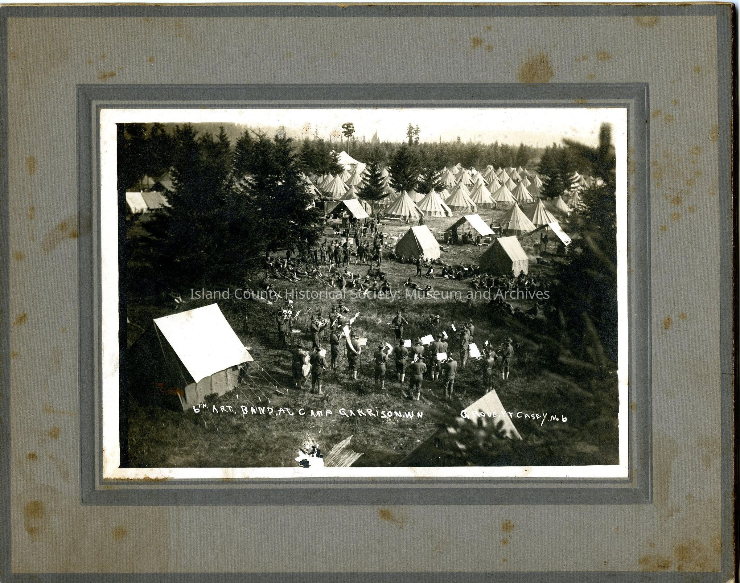 Black and white photograph of an encampment in the trees. Soldiers present throughout. Caption: "6th ART. BAND AT CAMP GARRISON WN GROVE FT CASEY NO. 6" On cardboard.