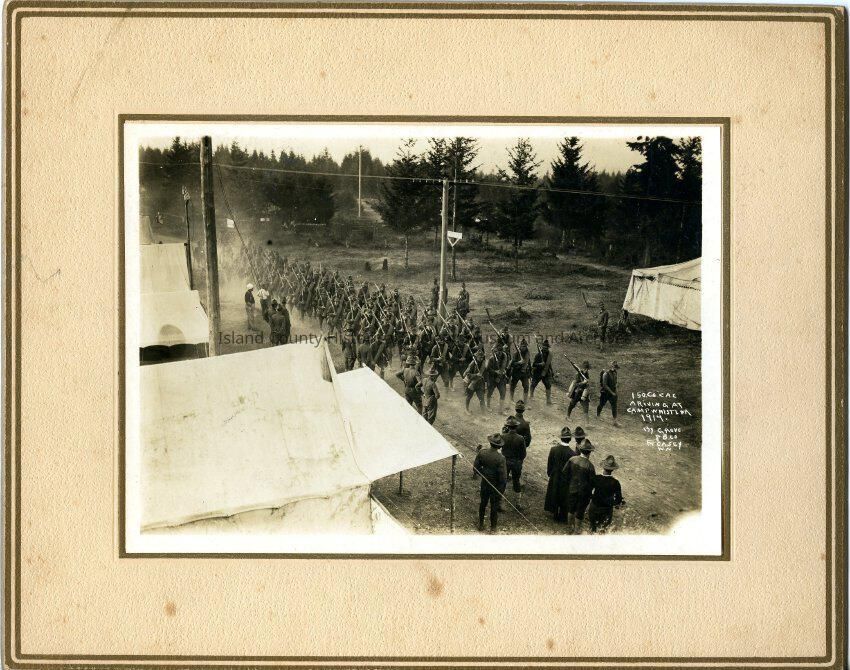 From old entry: "150 Company arriving at Camp Whistler, 1914. By Grove, Fort Casey, WN", Annual field maneuvers on the Olympic Peninsula. The 150 company was a submarine mine company from Fort Ward (near the Bremerton Naval Shipyard. All Coast Artillery troops were trained to land defend the forts along with 3-inch field guns and 7-inch siege howitzers. Most Camps were near Blyn, WA.Made/Created