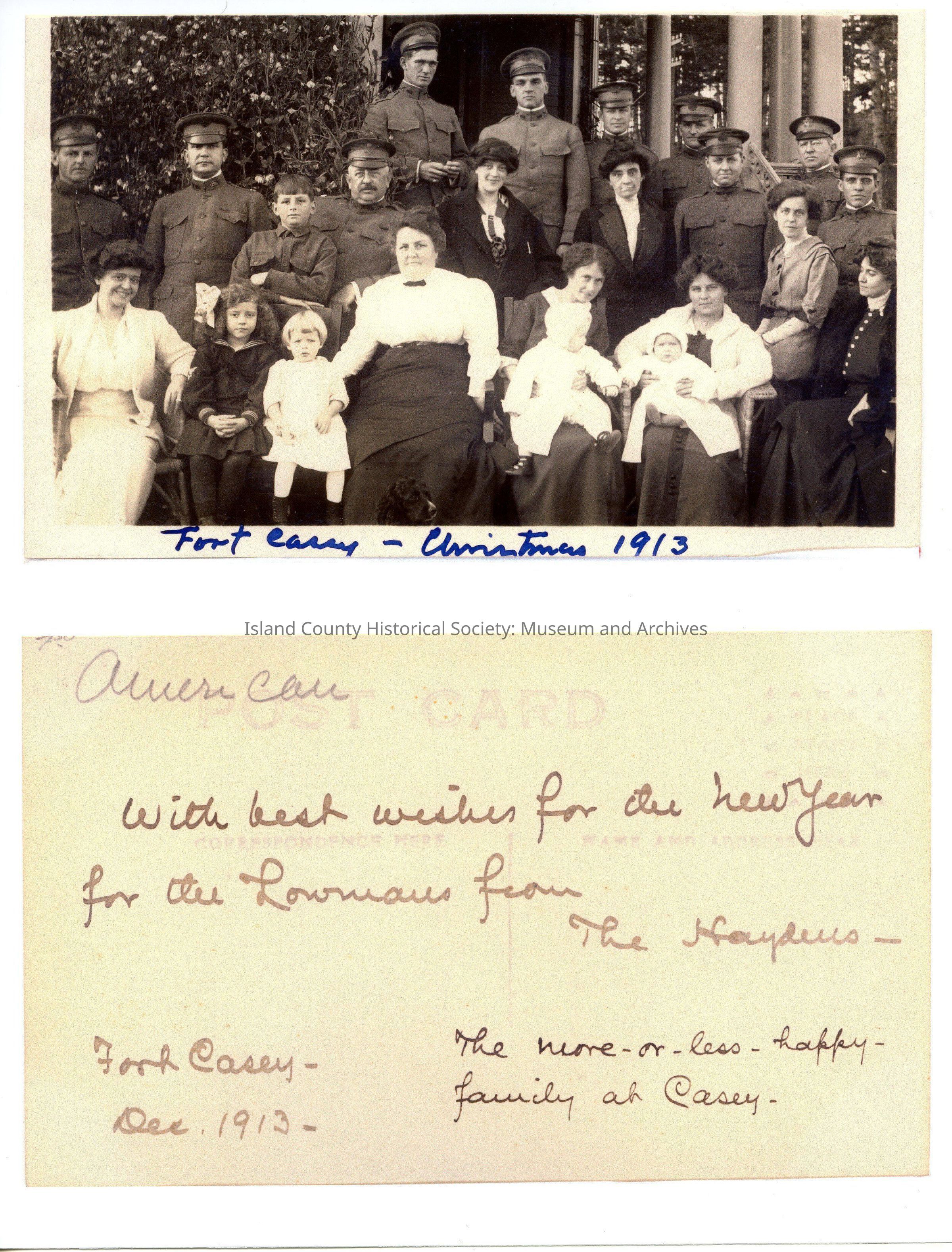 Black and white photograph of a group of posed individuals. Men in uniform, women in dresses, and children. There is an attatched note on the bottom from the Haydens, Fort Casey, Dec. 1913. On the back: arrows point to Col Hayden, his son, and his wife. It also says "Col Hayden, his family, the officers of the fort & their families"