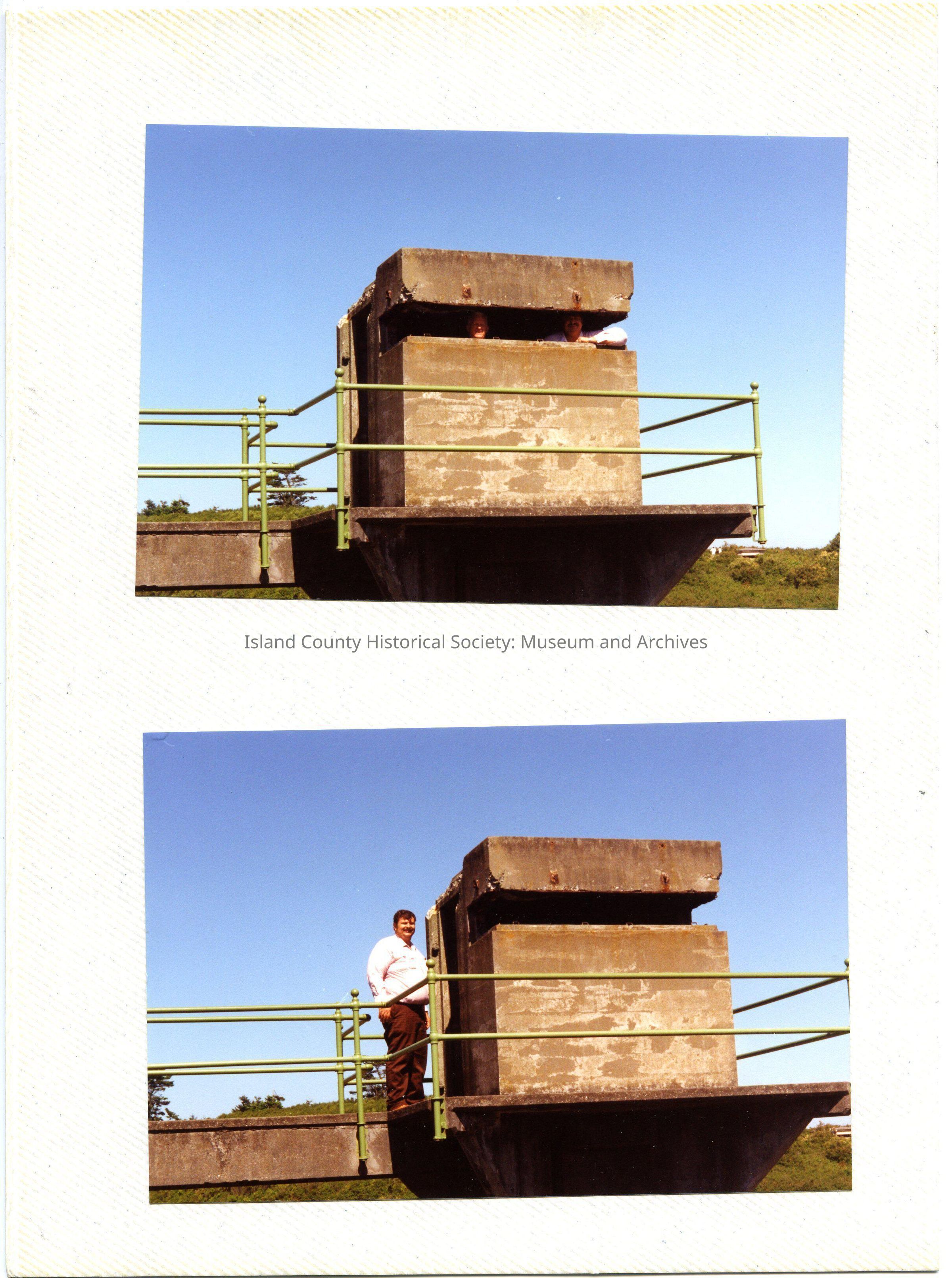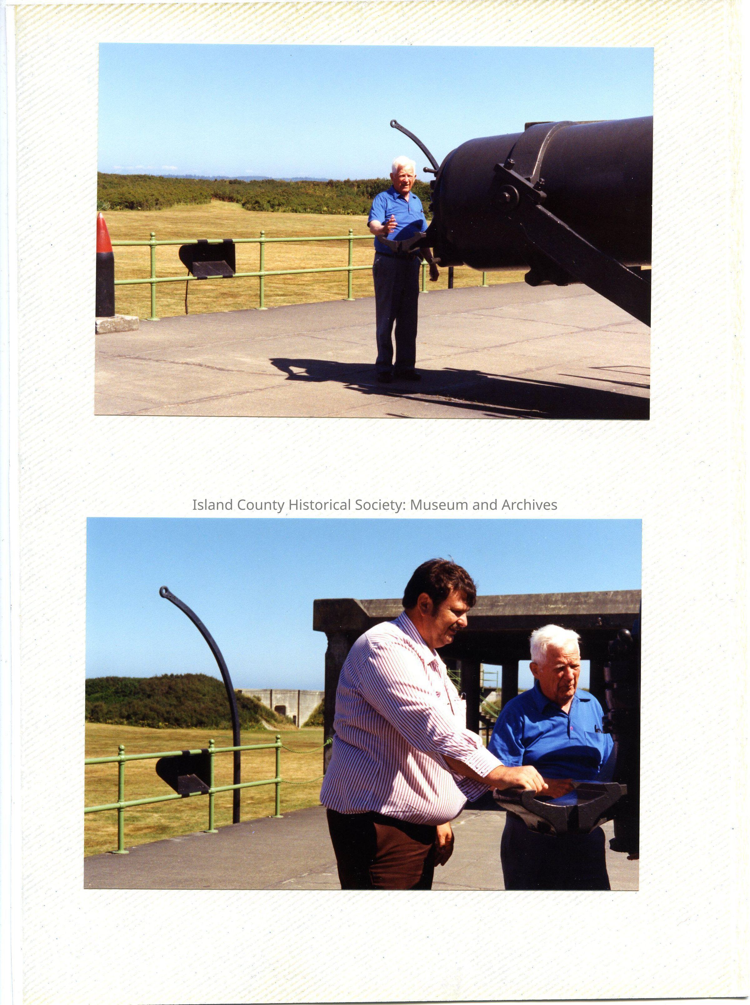 Four colored photographs of two gentleman looking around Fort Casey. They pose near the dissappearing guns and in the watch towers.