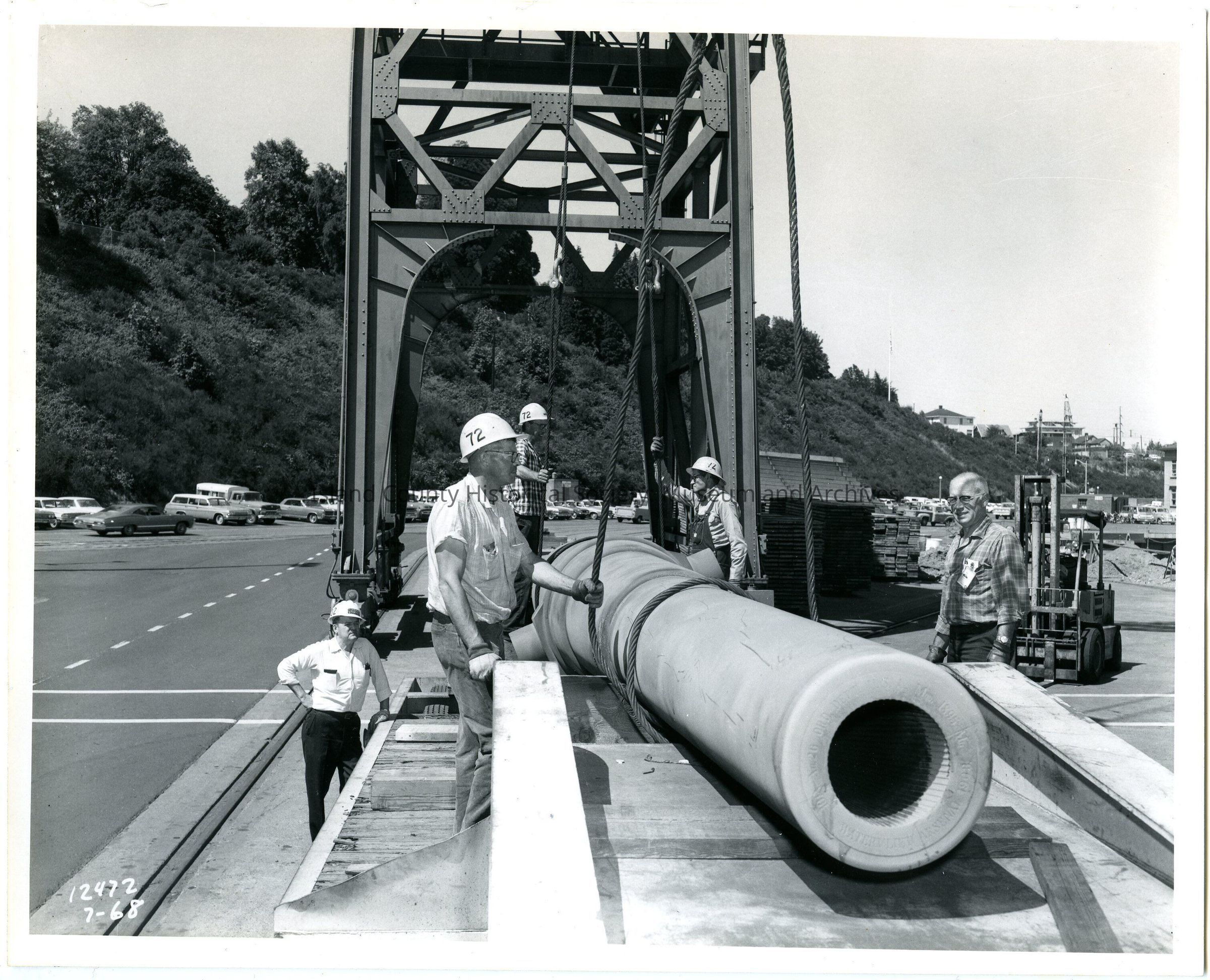 A black and white image of a work crew taking some of the Fort Casey mortars away on a truck. Cranes and cables were used to lift the heavy guns, and a forklift as well as classic cars are visible in the background.