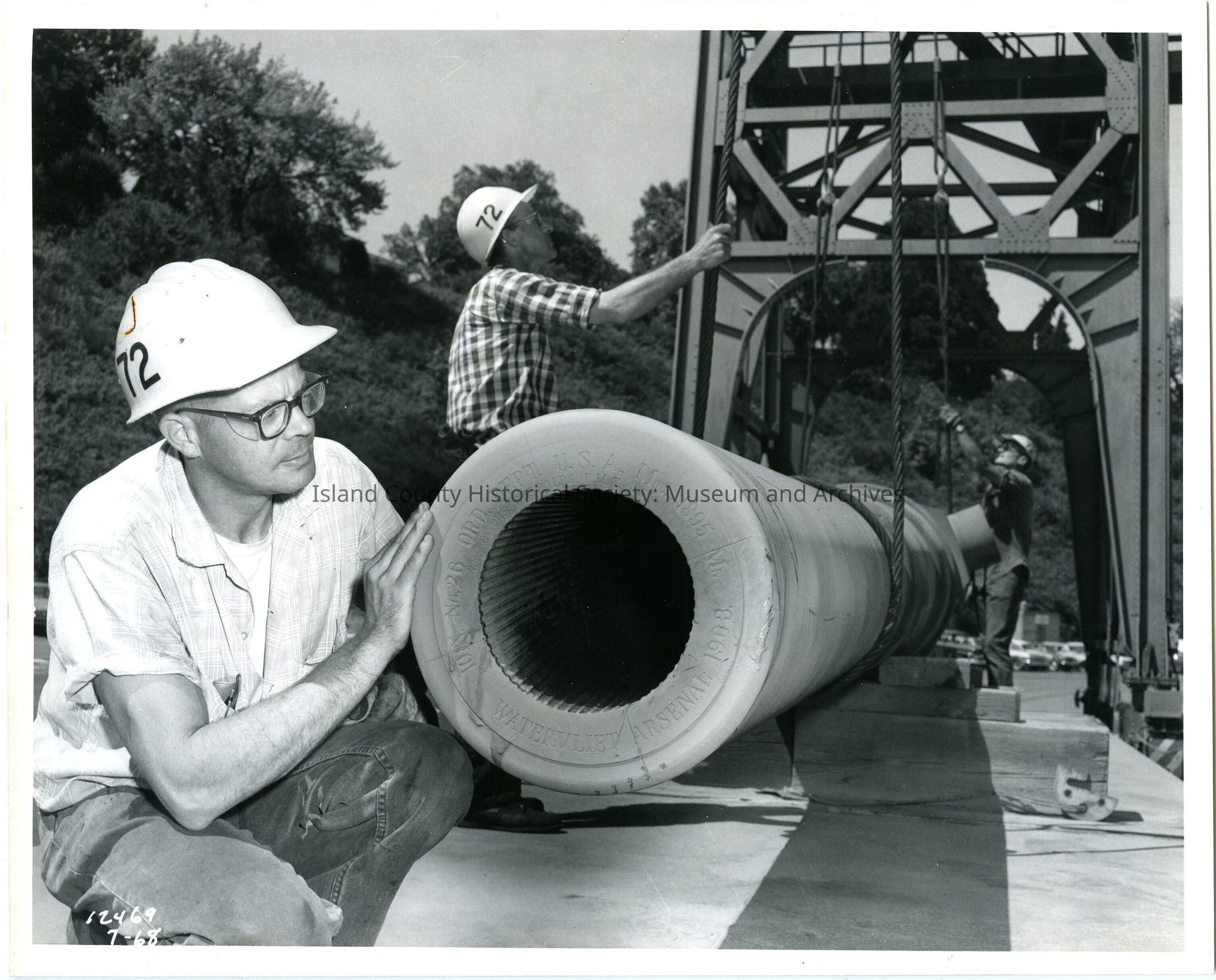 A black and white image of a work crew taking some of the Fort Casey mortars away on a truck. Cranes and cables were used to lift the heavy guns, a man with a 72 on his hardhat kneels in the foreground. Words are visible on the end of the barrel: "10IN No.26 ORD DEPT. U.S.A. Mod. 1895 Mi. WATERVLIET ARSENAL 1903."