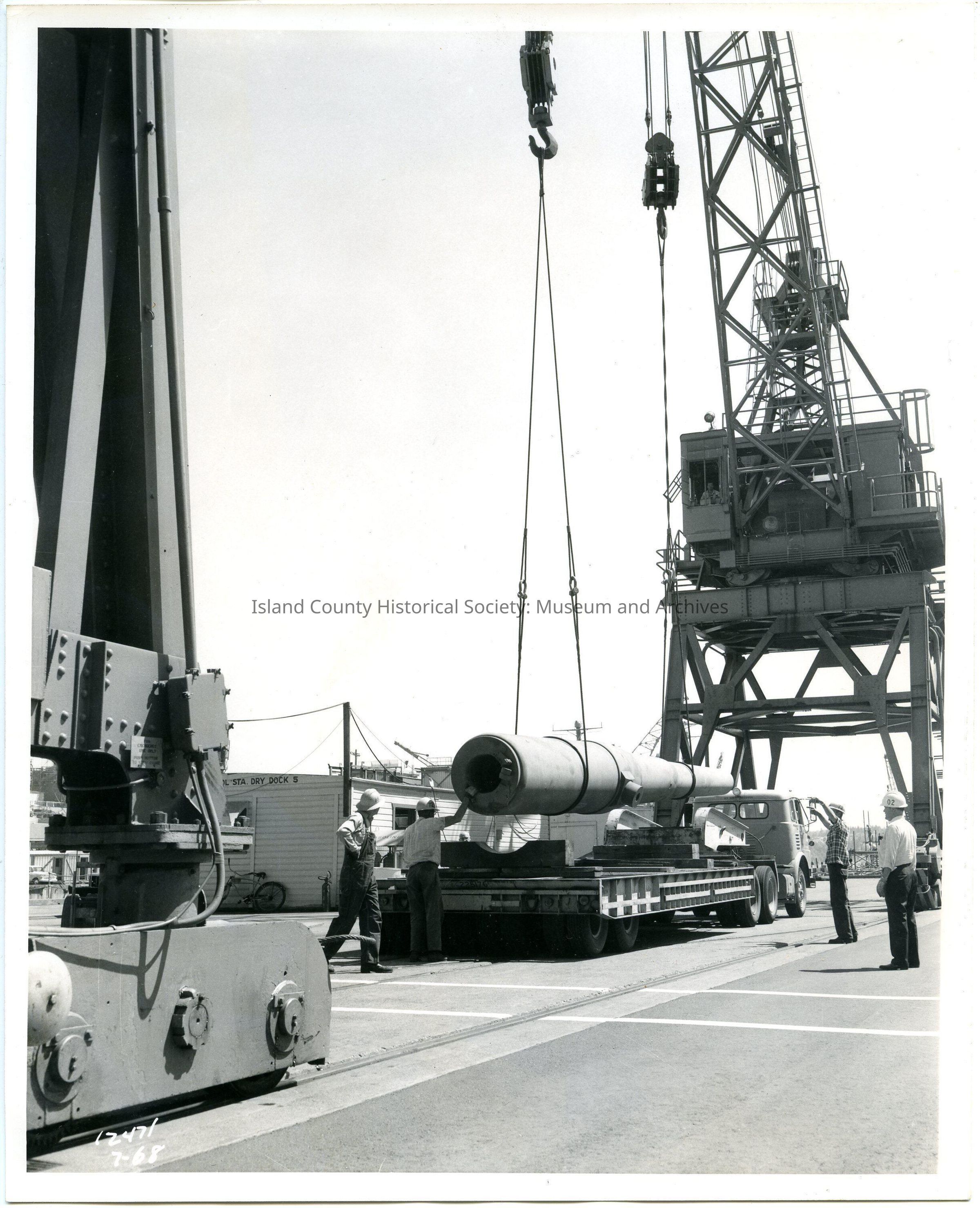 A black and white image of a work crew taking some of the Fort Casey mortars away on a truck. Cranes and cables are used to lift the heavy guns. Bringing in the dissappearing gun from the Philippines. July 1968 Written on the front: 12472 7-68