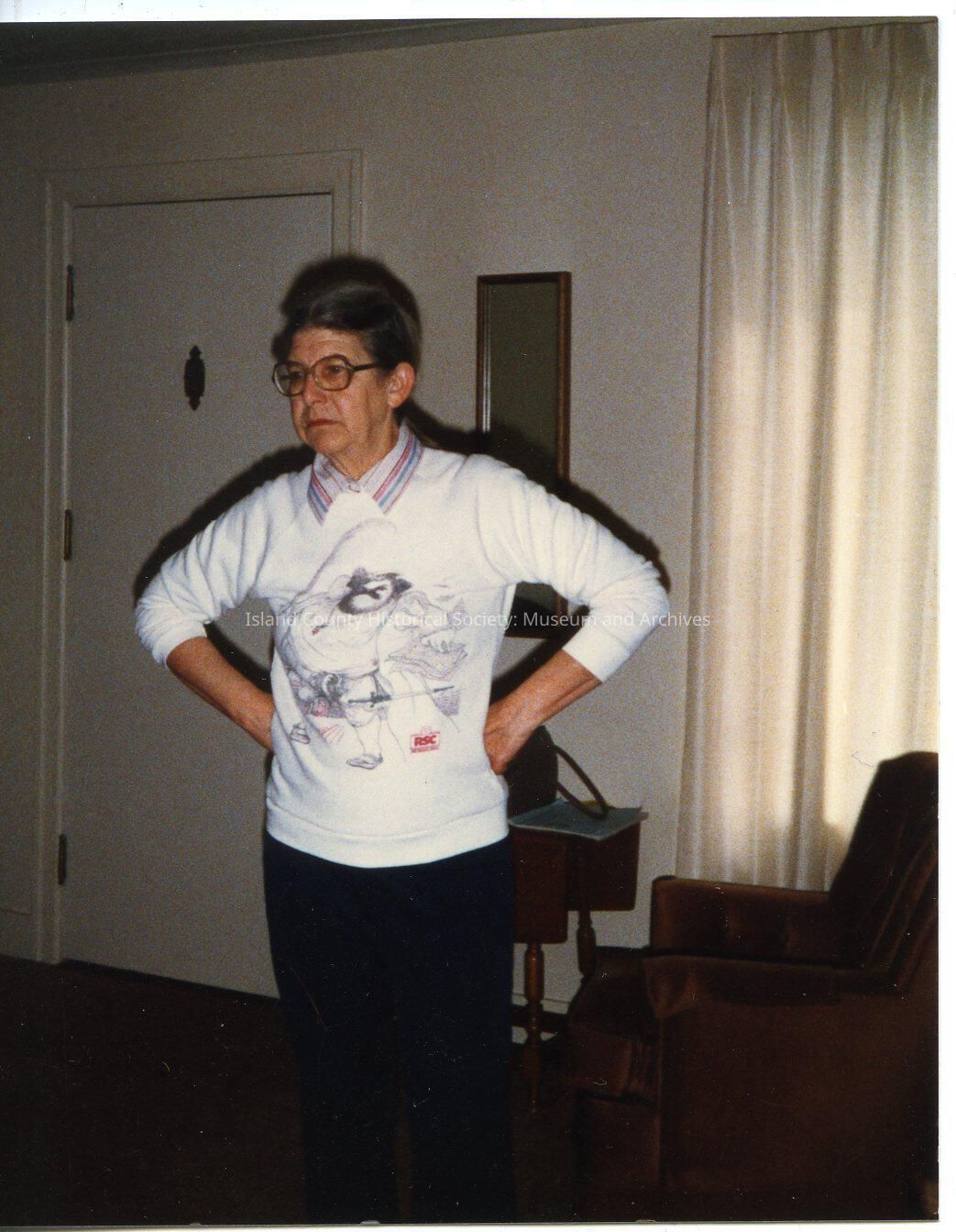 A photo of Jimmie Jean Cook standing in a house. On the back of the photograph is written Anacortes circa 1980. Other items in the photograph is a lounge chair and small side table. Color photograph.