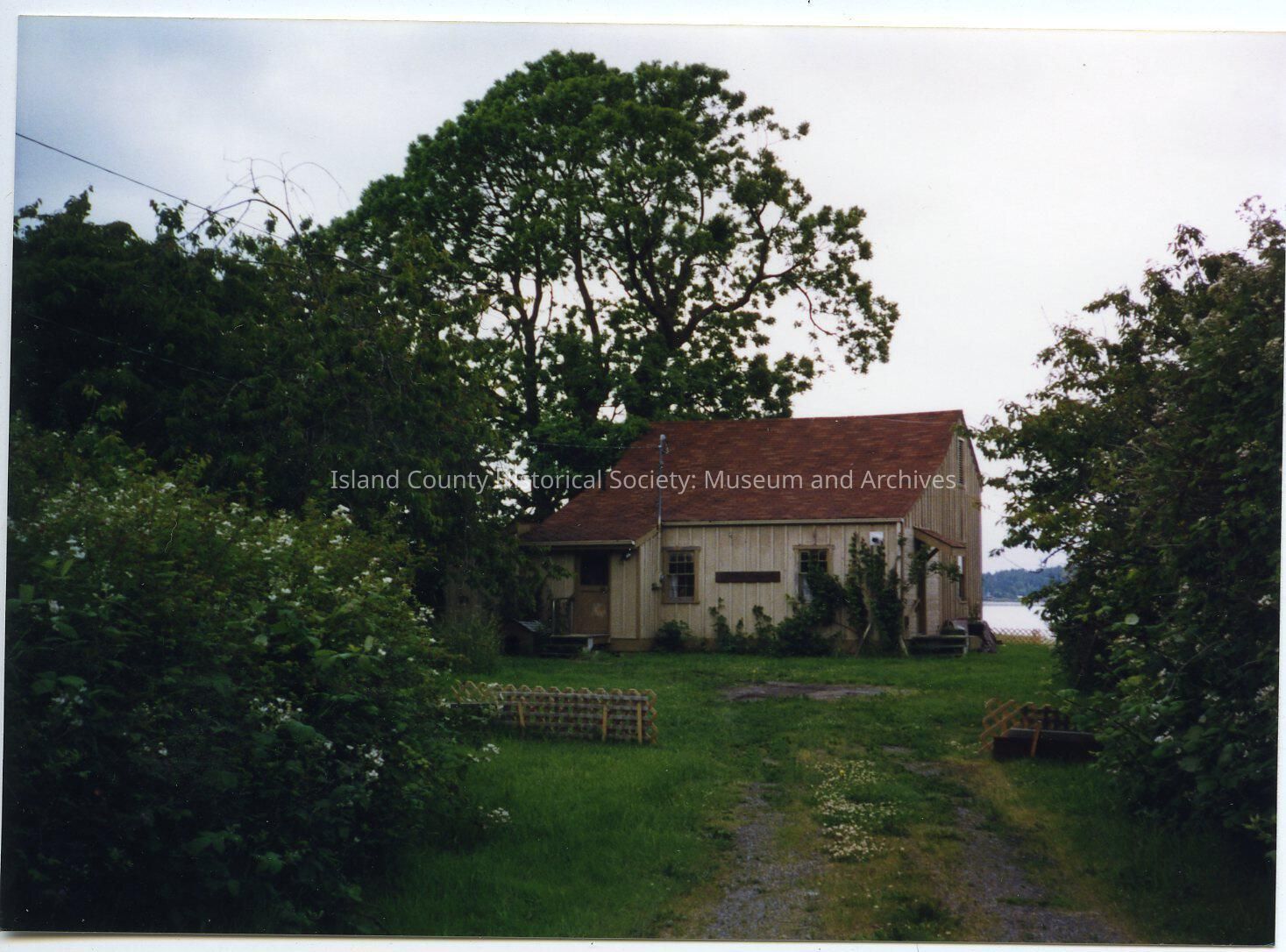 Captain Coupe house - from the road looking north (towards Penn Cove). Back of the house faces 9th Street. Trees and bushes are in front, back and along side the house.