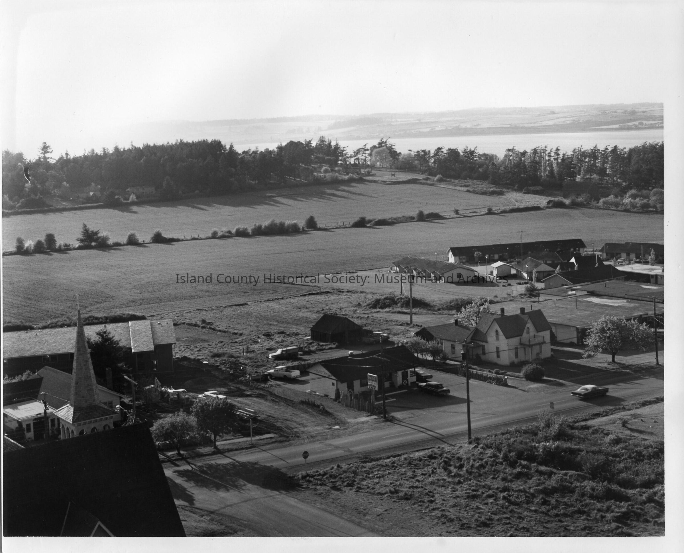Black and white picture of Kreuger Farm and the Congregtional Catholic Church on Main Street. A gabled house can be seen in the lower right of the photo and Penn Cove is in the background.