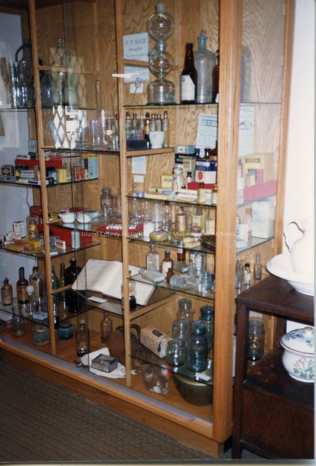 A color photo of a tall wooden case with glass shelfs with many (medicne?) bottles. On the right is a wooden table with a shelf. On top is a bowl and picture and on the bottom is a decorated container with a top. Handwritten on the back is "R. Bottle Case. 1989."