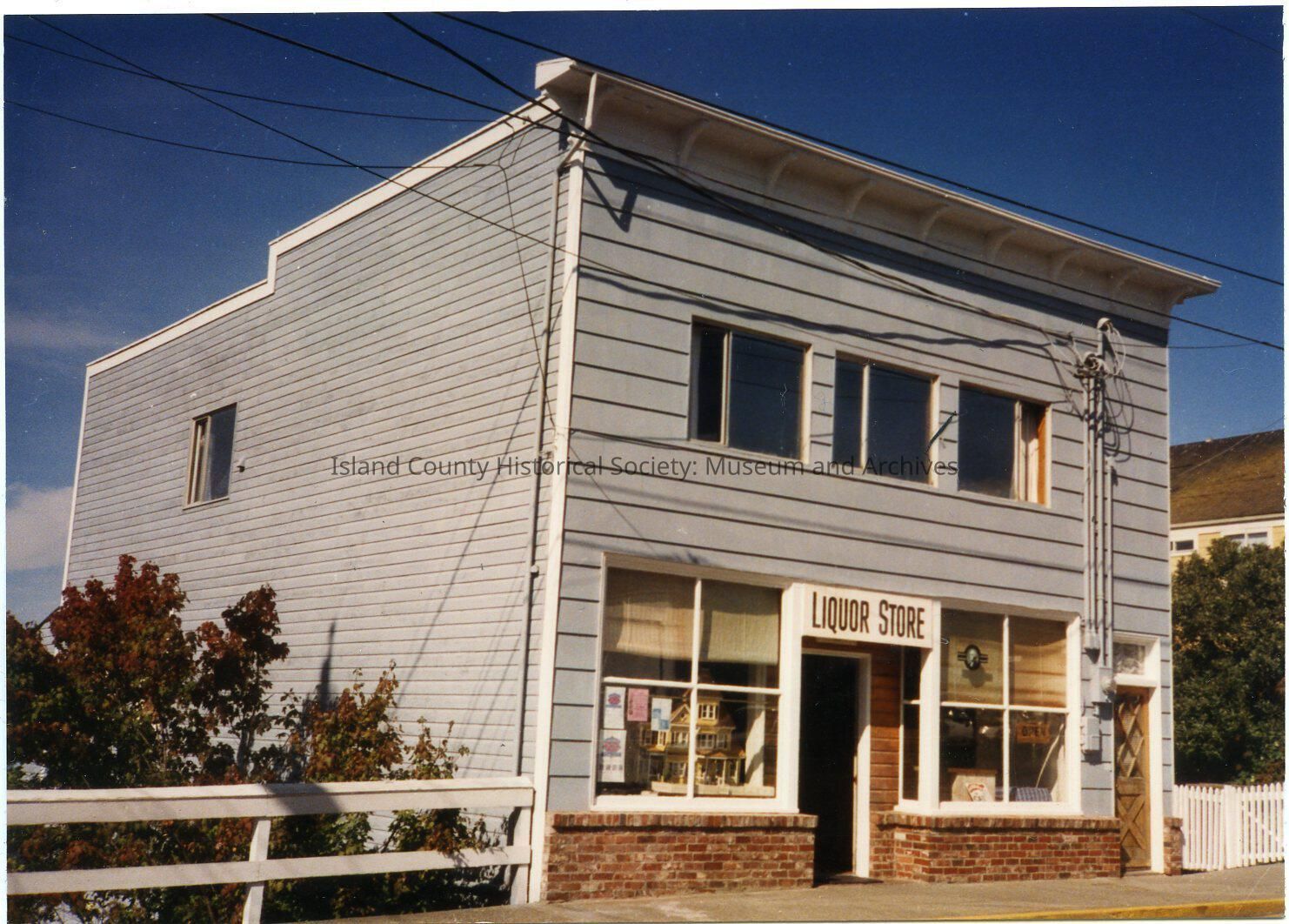 Photo of the Liquor Store at 16 NW Front Street from Penn Cove. The store has a flat roof. One window on the left side. The sign is over the central door. Picket fence on the right, rail fence on the left. On the back: Washington State Liquor Store. From a sticky note: Washington State Liquor Store