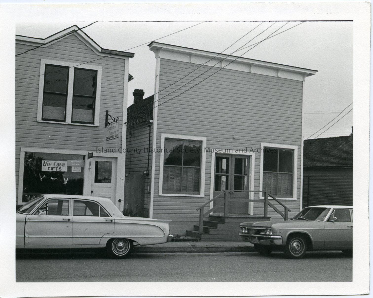 Photo of the two story building at 17 NW Front Street. It has a central peak roof line, one large window in second story, large front window and offset front door. There are two cars parked on that side of the street. Sign in the window: The Cove. Sign over the door: Chamber of Commerce, Central Whidbey Island. On the back: Lester Still law office 1909, Island Co. Times, W.T. Howard Pub. 1906. Photo - 1971